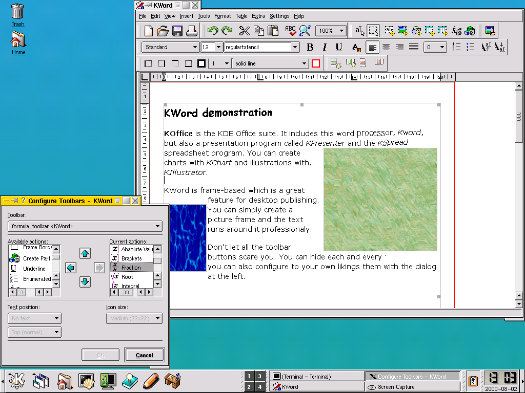 KDE a publié la première version stable de son environnement graphique en 1998, mettant en valeur un environnement de développement d'applications « KOM / OpenParts » et un aperçu d'une suite bureautique.